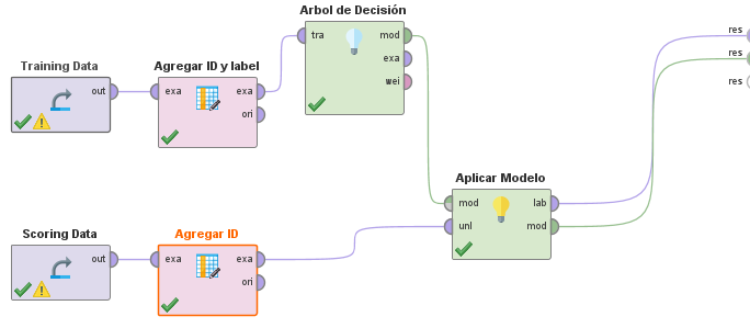 Agregamos un operador de Árbol de Decisión en el flujo de Rapidminer. El mismo usará el dataset de entrenamiento como entrada. El modelo resultante será probado mediante el operador “Apply Model”, usando el Dataset de Test.