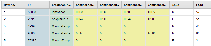 Al ejecutar el modelo con los datos de prueba, vemos que Rapidminer agrega 4 atributos de confianza y un atributo adicional para la predicción de la clase objetivo.